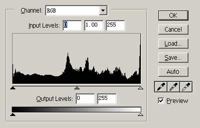 当我们通过扫描仪输入一副图像时,总是对它造成的颜色失真感到很头疼,但我们可以通过一系列的色彩调整技巧来弥补。首先调整图像的色阶。打开Adjust-levels色阶调整对话框。仔细观看图像的象素分布图。直方图代表了整个图像或是选定区域内的色阶分布,而水平轴表示色阶值,由0到255的变化。垂直轴表示拥有的其色阶的像素个数。看上去像一座座山吧?山高的地方,表示此色阶处的像素较多,相反的,就表示像素较少了。(图一)