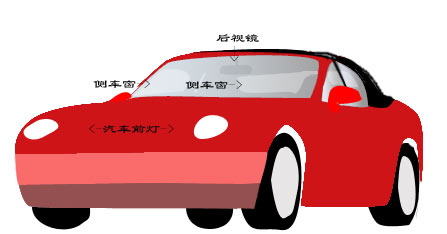 4.现在我们要对汽车的前灯,后视镜,侧车窗这类细节部份进行操作。需注意的是在对后视镜和侧车窗实行完填充后请将这两个图层的不透明度(opacity)调整至30%左右。接着将前景色置为RGB(206,211,222),背景色置为(156,154,173)利用线性渐变工具在“挡风玻璃和车窗”图层从左向右拖动。调整后的效果如下图。怎么样,是不是有了点汽车的味道?不过现在你还不能把它开走,因为接下来我们要为汽车添加上更多的细节。