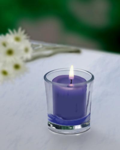 15)在“烛底”层下面新建一层,命名“蜡烛”。用钢笔钩出蜡烛的形状,填充蓝色(60/62/113)。对蜡烛的上部和两边进行高光和暗调的减淡,对底部和中间一些局部进行加深。由于蜡烛的上部受到烛光的照射会有些红色,新建一层,选择淡淡的紫红色(171/147/183),用喷枪,降低压力轻轻喷上一层。合并到“蜡烛”层。(15)