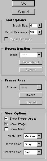 9 其他大部分的工具都是产生某种特殊效果的,这里就不加累述。 如果希望在变形某一幅图像的某一部分,而不希望其他部分不受到变形的影响的话。可以选择 Freeze Tool 工具。选择后用鼠标在希望不受影响的区域拖动,会有一层半透明的红色将此部分覆盖住,然后再使用其他的变形,红色被覆盖区域将不受影响。之后可以选择Thaw Tool 工具解除对图像的保护。而右边的Invert 按钮的作用是将把保护区域反选;如果想全部清除刚才的被保护区域,按 Thaw All 按钮试试看。 你甚至可以将你需要变形的部分保存在一个Channel通道里面,因为Luquily菜单里提供通道的选择。这是一个非常体贴用户的功能。它只能使用户使用起Photoshop来更加的得心应手。 选择Freeze Color 下拉列表可以选择被保护区域的颜色,也就是上面提到的“半透明的红色”。 下面来介绍一下图3下方的View Options部分的几个选项。 Show Frozen Areas的意思是显示冻结区域,也就是上文提到的用Freeze Tool覆盖住的不希望受到影响的部分。 Show Image的意思是显示图片。 Show Mesh:这是一个很有意思的选择。当它被选中以后,图象上会显示出一格一格的