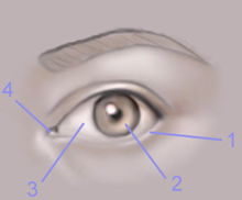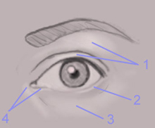 现在来表现亮区。图中标出的区域是我认为重要的部位。特别是区域2,常常被人忘掉。它沿着下眼脸的内侧走。因为眼脸并不是平坦的,它是包围着眼珠的厚折肉。