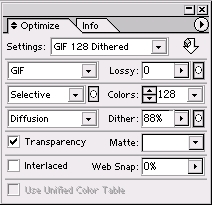 在浮动面板中的Settings(设置)下拉菜单中包含了一些预设的参数值。这些预设的设置能够帮助初学者快速的优化图像。在这个下拉菜单中包含了GIF 128 Dithered(GIF128色带抖动)、GIF 128 No Dithered(GIF128色不带抖动)、GIF 32 Dithered(GIF 32色带抖动)、GIF 32 No Dithered(GIF32色不带抖动)、GIF 64 Dithered(GIF64色带抖动)、GIF 64 No Dithered(GIF128色不带抖动)、GIF WEB Palette(GIF WEB调色板)、JPEG High(JPEG高质量)、JPEG Low(JPEG低质量)、JPEG Medium(JPEG中等质量)、PNG-24(PNG24位色)和PNG-8 128 Dithered(PNG 8位色带抖动),足足12种预设设置。这些设置能满足绝大多数的图像优化的要求。