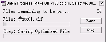 脚本)的文件。这样我们将一个图形文件或者是一个保存了若干图形文件的文件夹拖动到这个文件的图标上,它就会启动Imageready3.0然后按照你设置好的优化参数进行优化。在优化的同时我们可以看到一个优化的进度对话框,在上面有两个按钮——Pause(暂停)和Stop(停止),这样我们可以随时暂定或者中断优化。