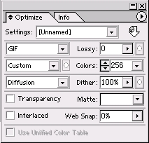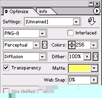 使用过Photoshop的朋友一定知道,在Photoshop中许多重要的操作包含在Photoshop右边的浮动面板中,作为Photoshop的姊妹篇,Imageready也有许多重要的操作在浮动面板中。在前面我们已经了解了一些浮动面板的一些操作,在下面的文章中我们将会详细的了解这些浮动面板的各种参数以及产生的作用。3.1 Optimize(优化)浮动面板