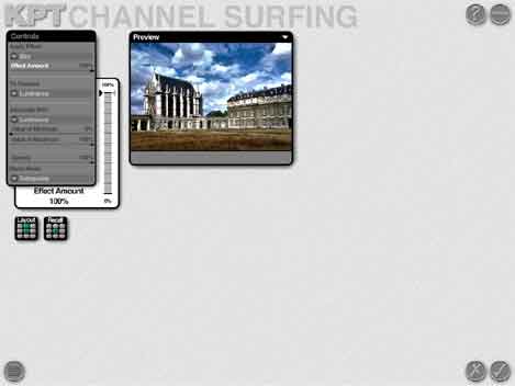 KPT Channel Surfing是一个处理通道的滤镜,它既允许你对所有通道进行调整,也可以允许你对单个通道进行调整。你可以给通道应用Blur(模糊)、Contrast(调整对比度)、Sharpen(锐化)和Value Shift(调整明暗)四种效果。你还可以调整这些效果的强度与透明度,并且控制效果同源图像的混合模式。