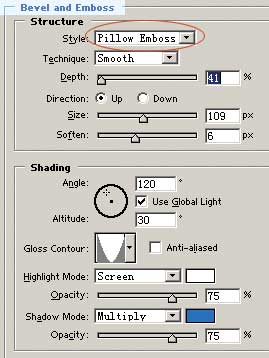 删除。这样做之前,需要先将应用过Layer Style的图层与一个空层合并以取消图层中对编辑效果的纪录状态在Bevel and Emboss子项中,Style选项为Pillow Emboss,它的效果比较丰富。我将Size调得很大,这就造成了轮廓边缘以外的部分透明光环,但轮廓内部的光线变化也变得柔和了。