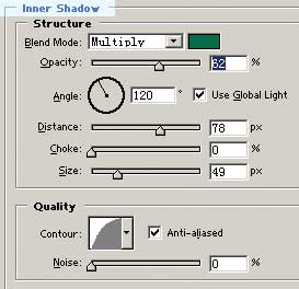 应用Inner Shadow后,效果有了明显的改善,原来明亮而缺乏内容的生硬高光有了更多的变化,更关键的是左上方加上了绿色高光色。我选择了较暗的墨绿色,用Multiply模式混合,由于光线的角度及Distance的调整,颜色混合并未影响按钮右下方,但整个光照度有所降低。