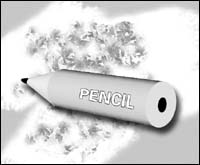 3. 再新建一个图层,使用“椭圆选框”工具绘制一个椭圆选区,用黑色进行填充,调整其大小后移动到笔杆末端作为铅芯,然后使用相同的方法绘制笔尖,效果如图2所示。