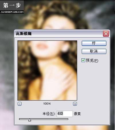 在原图上复制一个新图层,再对此图层进行大幅度的高斯模糊(GAUSSIAN BLUR),数值为4.0。
