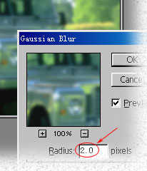 确定 Background copy 层为当前层,选择Filter->Blur->Gaussian blur,模糊度参数设置为2.0(如下图所示),按OK确定。