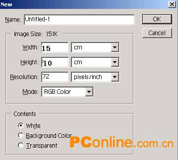 1、创建图形或文字。启动Photoshop(6.0以上的版本),单击File/New钮,在弹出的窗口中设置文档的尺寸,设置Width:15cm Height:10cm,按下OK钮,如图1-1所示。