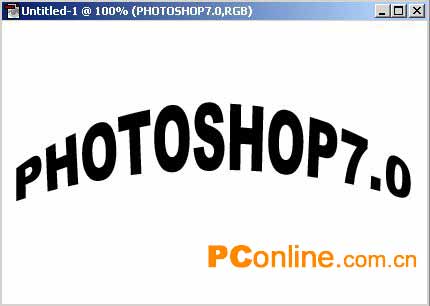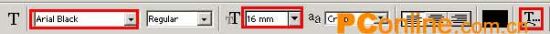 2、在Photoshop的工具栏上单击文字工具,然后在空白图像文档上单击,然后输入文字Photoshop7.0,在图像文档上方的工具栏中设置字体类型为ArialBlack,设置文字的尺寸大小为16mm,然后在工具栏上单击WarpText钮,如图1-2所示。