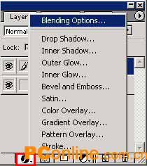 5、单击Layers调板底部的标有“f”字样的图标,将会弹出一个命令菜单,在命令菜单上选择最上方的BlendingOptions(混合)选择项。如图1-5所示。