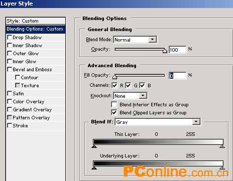 6、此时将会弹出LayerStyle对话框,在AdvancedBlendingG(高级混合)选项区中将FillOpacity的参数设置为0,如图1-6所示,此时图像中的文字会暂时消失,但是它的轮廓线依然存在,现在我们还看不出来,我们需要再为文字加入一个Stroke效果。