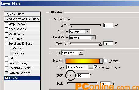 7、在LayerStyle对话框中,在左边的列表中勾选Stroke项,设置Size的值为3,设置Position的类型为Center方式,Fill的类型设置为Gradient方式,设置Gradient的颜色为如图1-7所示,设置Style类型为ShapeBurst方式,按下OK钮,如图1-7所示。