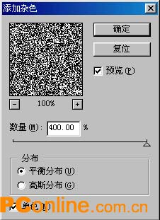 6、然后将鼠标移动到菜单栏上,分别将单击“滤镜”/“杂色”/“添加杂色”命令,随后Photoshop程序将自动打开如图3所示的参数设置界面,在该界面中,请将杂色数量设置为400,将杂色分布方式设置为“平均分布”,同时将该界面下方的“单色”选项选中。当用鼠标单击该界面中的“确定”按钮时,我们将看到一幅如图4所示的效果图;