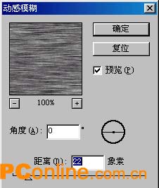 图47、下面再用鼠标单击主操作界面中的“滤镜”菜单项,从弹出的命令中选择“模糊”选项,接着再在其下级菜单中选择“运动模糊”命令,程序将弹出一个如图5所示的设置框,该设置框是用来对图层作运动模糊效果处理的,一般设定参数“距离”值为22pixels左右;
