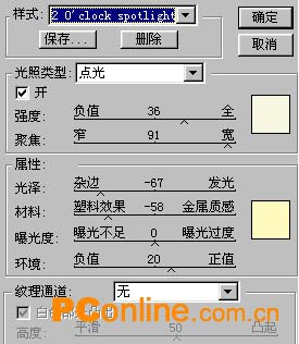 9、再将鼠标移动到主程序的菜单栏中,分别单击菜单栏中的“滤镜”/“渲染”/“光照效果”命令,在随后打开的光照效果参数设置界面中,请将光源的位置设置为“2 0'clock spotlight”,光照强度设置为“36”,如图8所示;