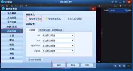 在播放器上,鼠标移到播放器上,点击右键,选择“播放器设置”,点击“高清加速”,选择“稳定兼容模式”,点击“确定”就可以了。
