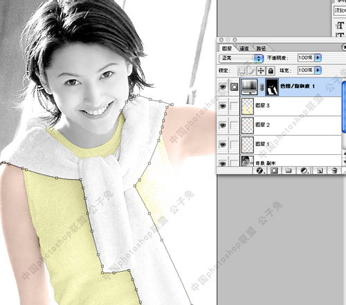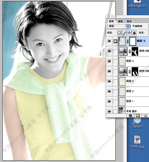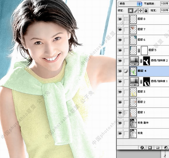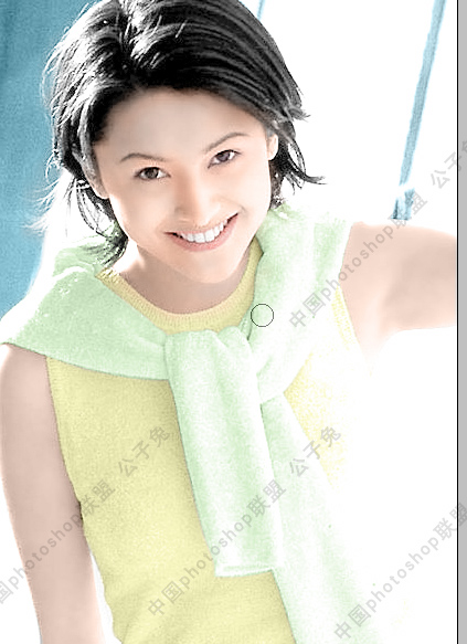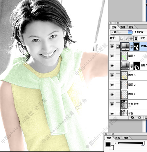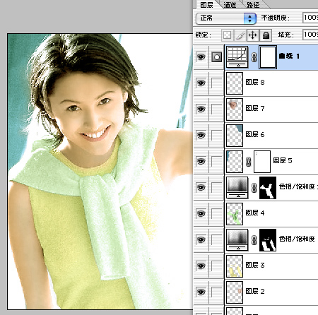第五,上色大体思路我认为仍然是从整体到局部,再由局部到整体。比如这张照片。我们要先从整体出发,考虑好这个MM的环境,和她自身的特质。健康阳光,很有活动。这时我们就要为他设计色彩。就这张照片而言,我个人觉得应该以清新的浅色为主,淡黄,淡绿的搭配由此产生,在这幅图中,环境色很少,这时我们可以把主要精力放在人物上,而环境色只要能和人物衣服色搭配合适就行了。设定完总体的颜色。再进行实际的局部上色。中间的步骤下面会有一些截图,希望大家看了能有所领悟,具体的我不细说了。因为已经有很多这方面的教程了。最重要的一点是要细心。我用的方法是最笨的方法。就是一块块的用钢笔扣出来,头发部分用配合通道来扣。然后一个图层一个图层的上色。先填充一层基本色,然后再用喷笔上明暗调,上色的图层所用的图层模式为[颜色]。当这些都进行完以后。大体上颜色就上完了。有些盟友这时就交稿了。慢着。这还没完。因为我们一部分一部分的上色。最后的成品肯定不是非常的自然。这是肯定的。所以最后还要有一步,在最顶层加一个色彩整体调整层。我的习惯是用[曲线]调整层。“便宜量又足,曲线,我一直用它??!”。这时才算是完工了。总之知识是死的,人是活的,不要死背教程。