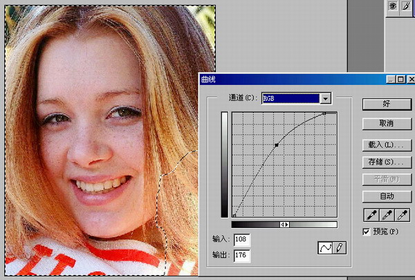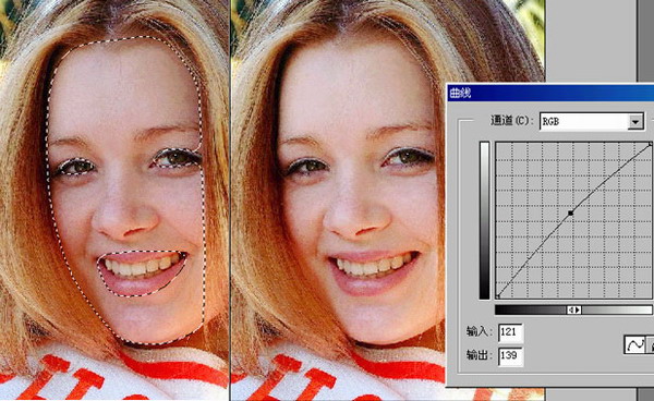 4.现在我们再来看一下,整体画面的亮度和面部的雀斑已经有所改善。但是皮肤部分,我仍然觉得有些暗,不够白。所谓一白遮三丑,想让MM的照片漂亮起来就让它白一点吧。(但也不要太过份哟)。我用钢笔工具,勾出皮肤的部分,再勾出眼睛嘴巴。只留下皮肤部分。羽化5。同样,用曲线工具,提高它的亮度。