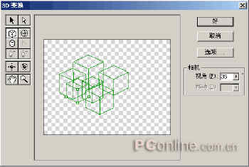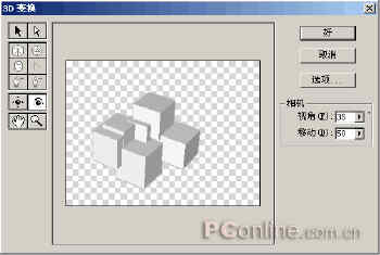(11)新建一个图层,执行“滤镜>渲染>3D变换”命令打开“3D变换”对话框,在其中选择“立方体”工具绘制多个不同大小的立方体,如图11所示,然后使用“轨迹球”工具对这些立方体进行旋转生成立体图形,效果如图12所示。