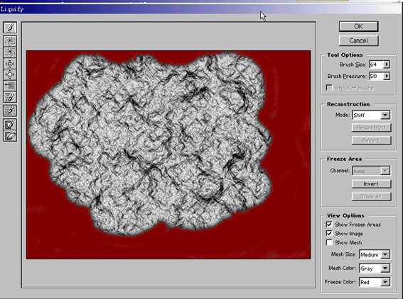 8. 按CTRL+SHIFT+X或菜单Image—Liquify,出现如图所示的面板,面板上预览区里的红色部分是遮罩,表示红色部分是被“保护”而不会被编辑的。