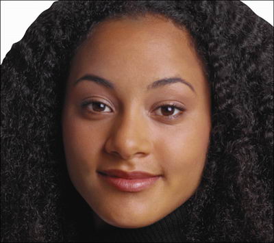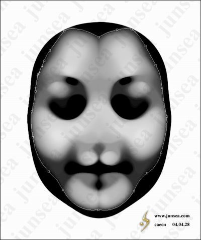 8.用钢笔工具,沿着脸部内侧的黑色边缘分界处勾勒出路径(图9),并将路径转换为选区,羽化一个象素后,执行菜单-选择-反选,并将两个图层中的被选中部分删除(图10)。