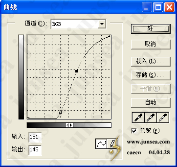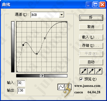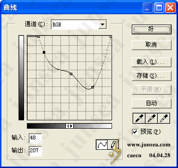 5.将图层1副本复制一个为图层1副本2,置于图层面板的最顶层,执行菜单-图象-调整-曲线,设置如(图5)。并将此图层的混合模式设置为颜色加深,完成后如(图6)。