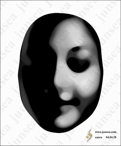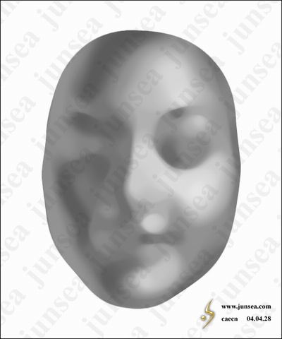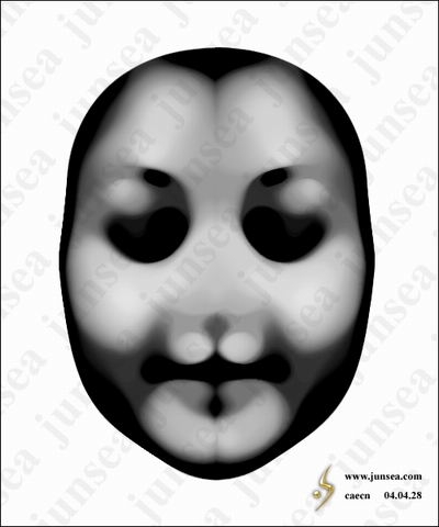 6.用矩形选框工具框选左面的半边脸,删除选中部分,并将剩下的右半边脸复制一个,执行菜单-编辑-变换-水平翻转,按住SHIFT将翻转后的半边脸水平移至左边,并与右边的脸拼合在一起,可用方向键做单个象素的移动,使其中间完全没有缝隙,完成后将此两个半边脸的图层合并,并仍将图层的混合模式设置为颜色加深(图7)。