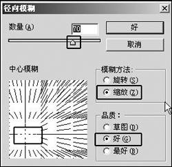 5.选取菜单命令“滤镜→模糊→径向模式”,弹出径向模糊对话框,将“模糊方法”选为“缩放”,将“品质”选为“好”,然后通过“数量”下的滑块调整数量为“70”,用鼠标在将“中心模糊”栏的左下方点一下,表示以此为点扩散,具体设置如图2。