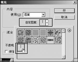 5.将图层1作为工作图层,按下“Ctrl+A”键全选工作区。选取菜单命令“编辑填充”,在“自定图案”下列选项中选择刚才定义的图案(如图6)。