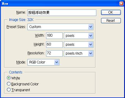 在该对话框的Name文本框处,大家可以输入“按钮浮动效果”这个图象名字,同时在Width、Height设置栏处输入新建图象的宽度为180像素、高度为60像素,将图象的Resolution(分辨率)设置为72pixels/inch;在颜色摸色(Mode)设置栏处,将图象的显示模式设置为RGB color,并在Content设置栏下,将图象的背景颜色选择为“White”,设置好这些参数后,单击该对话框中的“Ok”按钮,返回到主编辑界面;