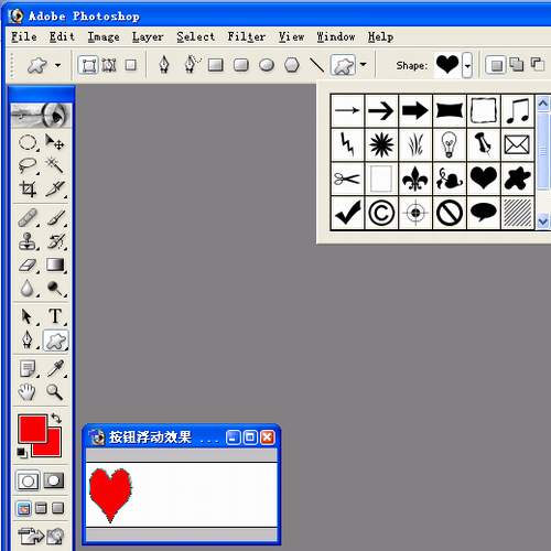 3、将鼠标移动到主界面左边的工具条的“custom shape tool”形状工具按钮上,此时在主界面的顶部出现了定制花型工具条,当大家用鼠标单击Shape设置栏右边的小三角时,Photoshop程序随后弹出了许多花型图案供大家选择;笔者在本例中选择了一颗红心,按下键盘上的shift键,将红心图案等比例在编辑区中显示出来,如图2所示的效果;