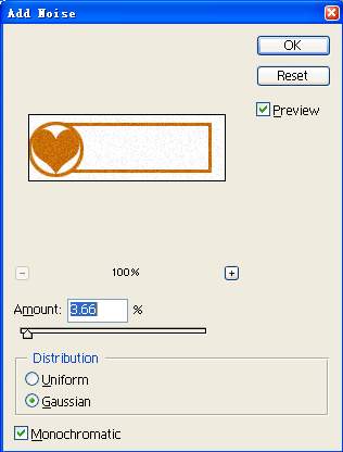 在这个对话框中,大家可以为当前的图象添加杂色。在具体添加时,大家可以在Amount设置栏处输入3.66,将杂色的分布方式(Distribution)选择为高斯分布(Gaussian),同时将Monochromatic(单色)这个选项选中,设置好这些参数后,单击“Ok”按钮返回到主编辑界面;