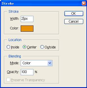 9、下面大家再把编辑区的前景色设置为#e88e07,同样执行主菜单中的edit/stroke命令,在弹出的描边参数设置框中将描边宽度设置为2像素,如图5所示;
