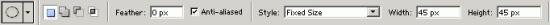 先打开PHOTOSHOP7,按 Ctrl + N,新建一个 Width=48 pixels,Height=48 pixels 的空文档,设置选择工具为“Elliptical Marquee Tool-圆形”选择工具,双击鼠标,在工具面板上部出现的属性设置栏里设置:Feather=0 px,Anti-aliased,Style=fixed Size,Width=45 px,Height=45 px。设定选区为直径是45的圆。