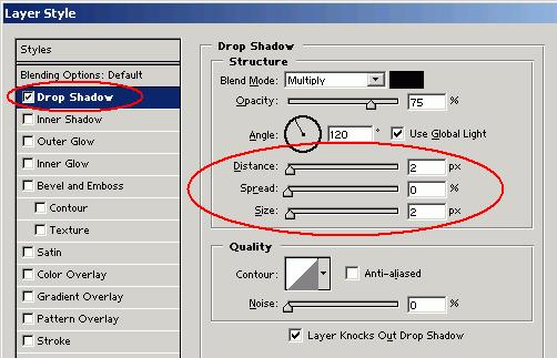 按“Ctrl + D”消除选区,双击此层应用层样式“Add a Layer Style”,在“Layer Style-层样式”设置面板中选择“Drop Shadow-下拉阴影”,参数设置为:Distance=2,Size=2,其它为缺省值。如图八所示: