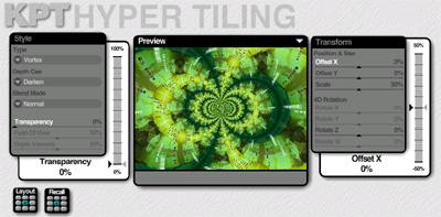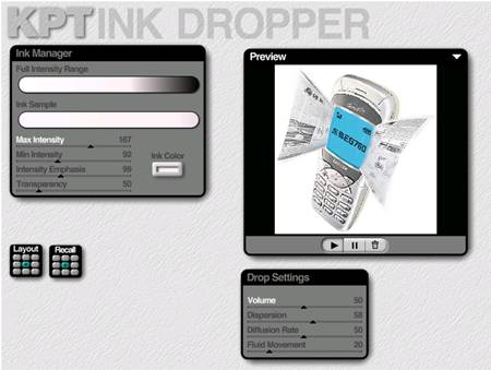 如果你开始选择的拼贴是属于4D空间的,可以将拼贴效果绕4d空间的坐标轴(x、y、z、w)旋转(w)是4D空间特有的,沿(W)坐标旋转,类似于把3d形状从内向外翻起KPT Ink Dropper