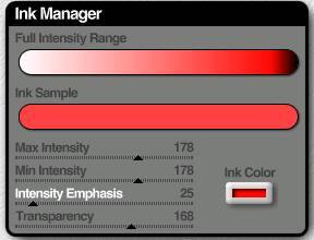 Ink Manager 面板上的Max Intensity参数是调整效果相对集中的明暗度,注意观察面板中 Ink Sample 颜色条的变化。