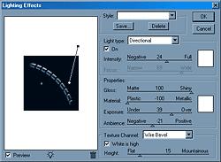 12、回到层窗口,选择层Cut Wire。选择"Filter > Render > Lighting Effects... ",创建一白色平行光(Directional Light),然后将它的方向调整为如下图所示,