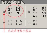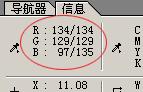 让我再来给你介绍一种很有用的工具:信息面板。如果没有,那就从窗口打开,并且永远让它在你的桌面上占一席之地。(图18)不管你当前选择的是什么工具(文字工具例外),将鼠标指针放在画面上,信息面板就会出现指针下那一点像素的颜色信息。懂得用数字来调整颜色才能称得上真正的精通颜色修正。关于数字值这篇文章里我们不打算过多的讲述,但这种方式和别的方式有很大不同,在你调整颜色时只要记住一点事实:一个中性色的像素,它的RGB值应该是相等的。不管他们是什么,但它们都相等。从浅灰色到深灰色颜色值会有很大差别,但如果它的R=G=B,那么它就是中性的。我们的眼睛和大脑具有高度的适应性,他们共同工作,可以赋予物体大脑所认为的黑色,白色或是中性色。彩色容易从显示器上估计,但黑色,白色,特别是中性色应从信息面板中确定。