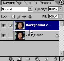 8、让被隐藏的复制出来的层重新露脸吧,然后选用橡皮擦工具,调整好适当的大小和透明度,在该层上擦去该MM的皮肤。只剩下眼睛 、嘴巴、眉毛和有明显凹槽的地方不要擦去(这些地方对MM而言相当重要,必须清晰,所以不能擦掉)。
