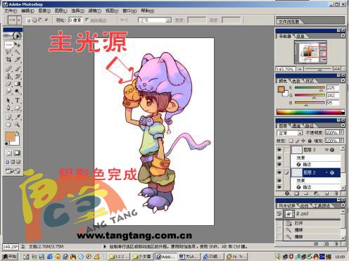 6)现在开始给人物进行第二步着色,这一步目的是为了给人物身上各物件加上阴影色,所谓的立体感.这一步还是先从人物的肌肤开始着手上色,然后逐渐向临近的物件上色.注意给各物件上阴影色的时候,要统一主要光线的来。