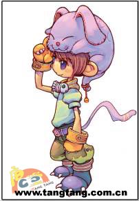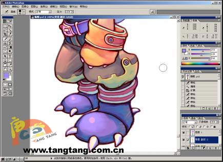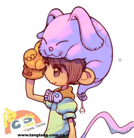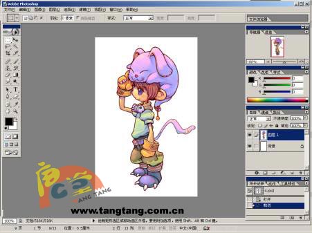 4)先给整个人物的各个物件都涂上基本色.这一步可以说很重要,也可以说很次要.重要是因为这个基本色几乎会决定了整个人物色彩的最终效果.次要的是无论最终效果怎么样,最后整理的时候还是可以用功能调节补救的(这就是电脑绘画的伟大之处啊).但上基本色的时候还是要讲究一下色彩的搭配.每一个单独的颜色想要表现出它在一个画面中独有感觉,都是需要另一个色彩跟他搭配或者冲突而产生的.颜色跟足球一样都是讲究团体合作的.一幅画里面要是只用单一的一种颜色,只做黑白灰变化的时候是很容易控制画面效果的,可是现实中的每个物体本身都会受光源照射而产生的色彩变化,还会受周围的环境色的影响产生的色彩变化的,两种以上的颜色放在一起的时候那就要讲究选色的搭配了.