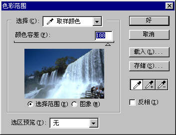 在合成过程中,我们通常需要几幅图片的某一局部,于是对图像的选取就不可避免了。常用的选取方法有多种(魔术棒、选框工具、套索工具、选择菜单中的色彩范围命令均可),魔术棒工具较适用于选择成块的色素,选框工具较适用于框定规则的形状,套索工具与其相反,用来选取不规则的形状,下面我们介绍使用色彩范围命令完成对瀑布的选定。首先激活“B图”,执行选择菜单中的“色彩范围”命令,选择“图像”单选按扭,我吸管点取瀑布的白色部分,再选择“选择范围”单选按扭,调整颜色容差值,使瀑布的大部分被选中,单击好,完成选取的第一步。(如图)