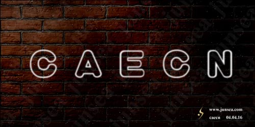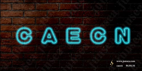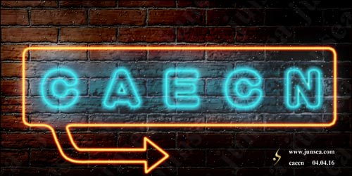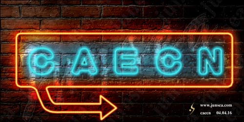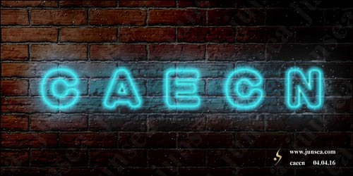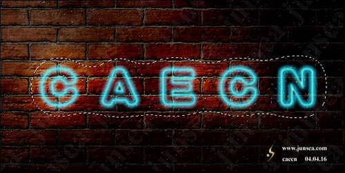 12.好了,灯管也完成了,最后可将选区内背景部分的亮度调底一点,再将对比度调高一点,投影的光就OK了,还可在文字及霓虹灯框的图层样式里添加‘投影’效果,那样能使霓虹灯跟背景墙壁看起来更好的结合。或者可在背景图层上面建一个新图层,在上面输入一些文字,文字颜色设置为白色,将图层混合模式改为‘叠加’,并可在土曾样式面板中选上‘内阴影’跟‘斜面浮雕’效果这样变能充斥一下画面,使画面看起来更丰富(图12)。