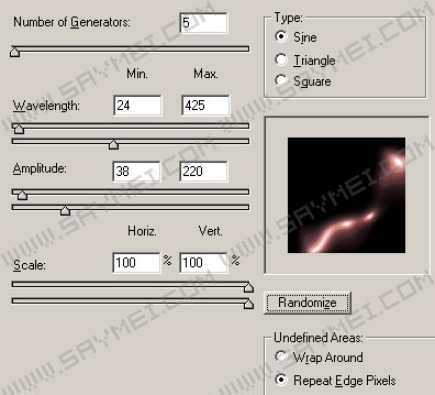 4.执行filter>distort>wave,调整好各项参数,然后按Randomize按钮,直至满意为止(光效的最终效果取决与此,各项参数都可作出很多变化)。
