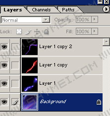 5.选取该层(layer1)的混合模式为Screen,然后复制这一层,并执行filter>distort>wave,然后再复制Layer 1 copy,再执行filter>distort>wave