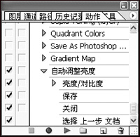7. 在确保“自动调整亮度”各项记录都选中的情况下,选中最前面的图像文档,不断单击动作窗口下面的[播放]按钮(或按自定义的热键F12),便可以自动处理、保存、关闭图片文档,直到最后一个文档为止(如图2)。